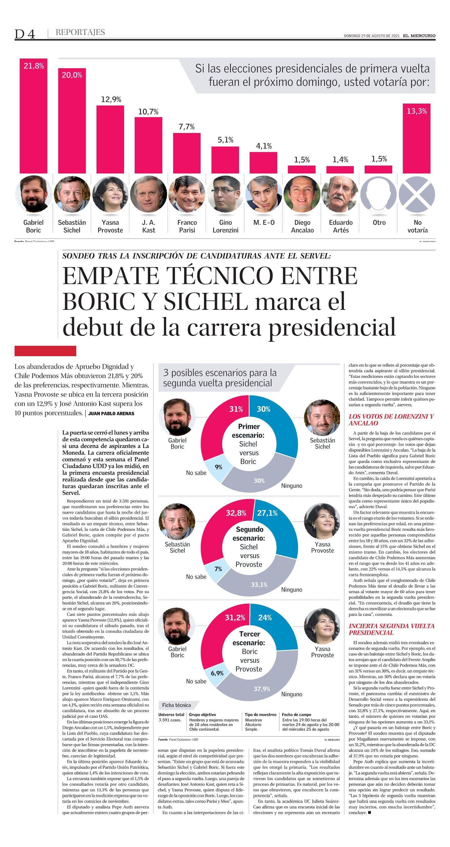 | Cadem | 6 ago. | 6 ago. | 702 | 3.7% | 21.0% | 10.0% | 10.0% | 24.0% | 35.0% | ||||
